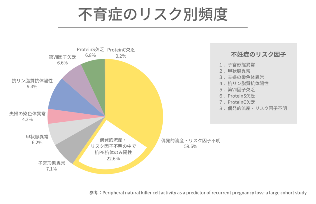 なお、厚生労働科学研究班(齋藤班)によると、不育症のリスク要因は、子宮形態異常(7.8%)、甲状腺異常(6.8%)、夫婦の染色体異常(4.6%)、抗リン脂質抗体陽性(10.2%)、第Ⅻ因子欠乏(7.2%)、Protein S欠乏(7.4%)、Protein C欠乏(0.2%)で、残りの65.3%は偶発的流産・リスク因子不明でした。