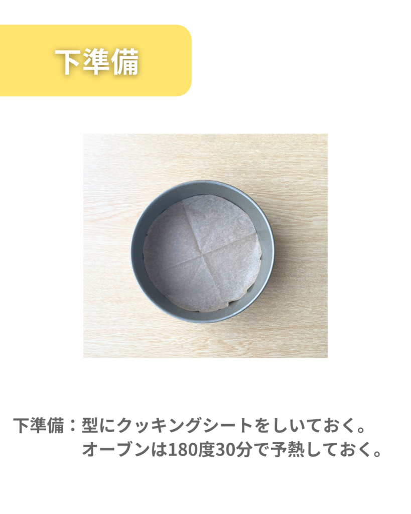 下準備:型にクッキングシートをしいておく。オーブンは180度30分で予熱しておく。