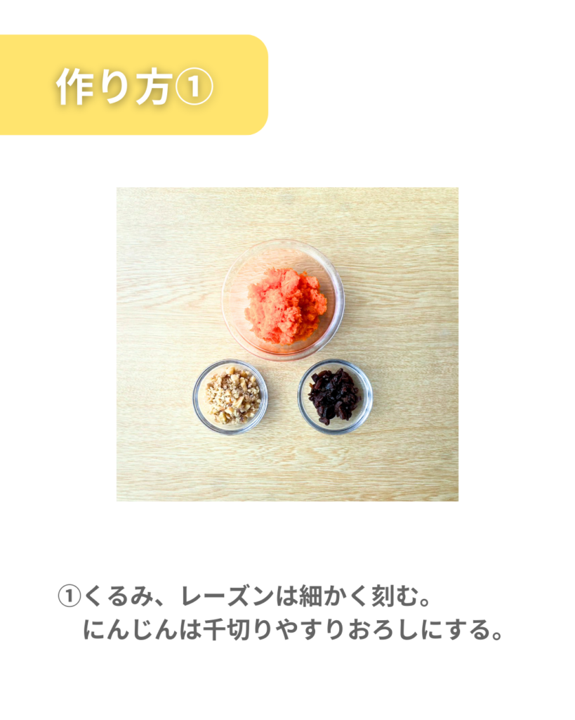 ①くるみ、レーズンは細かく刻む。にんじんは千切りやすりおろしにする。
